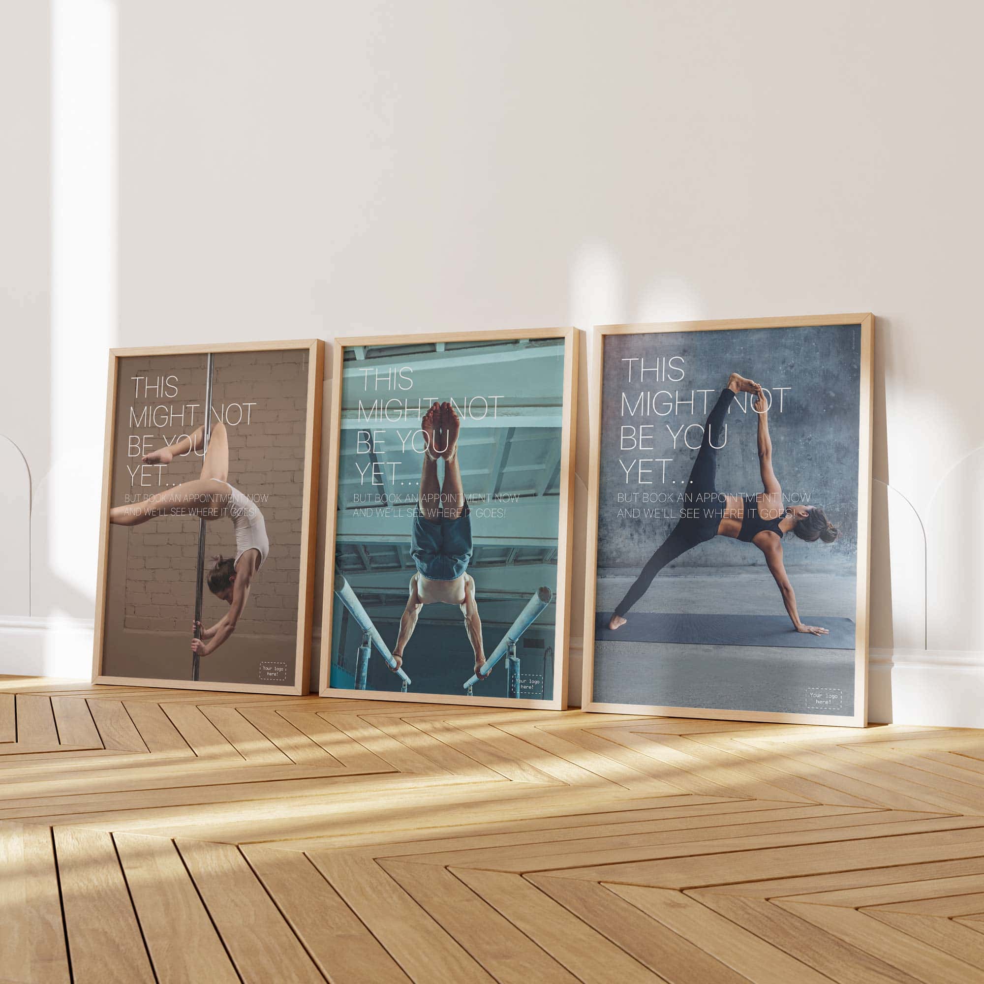 The Not Yet… Series consists of three variations of the same message, each featuring a different striking movement image while maintaining the same motivational text. Together they create a playful reminder that improvement is a process — and that every journey starts with the decision to begin.