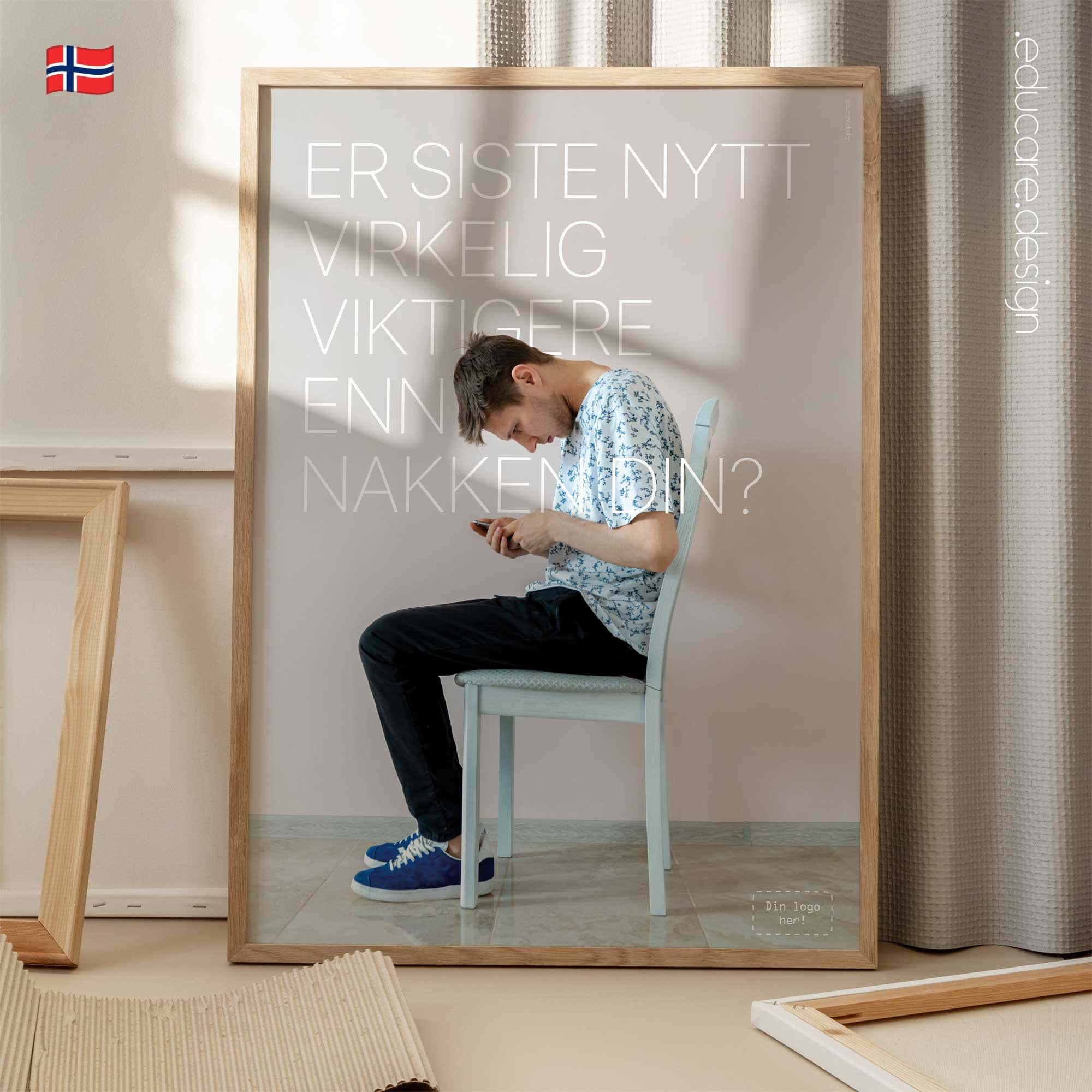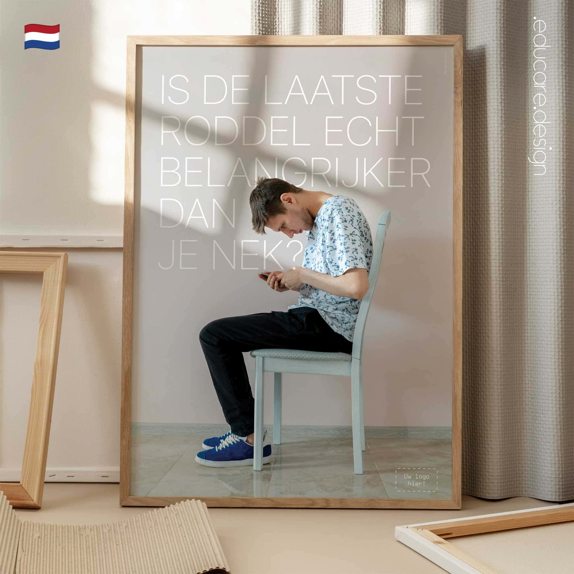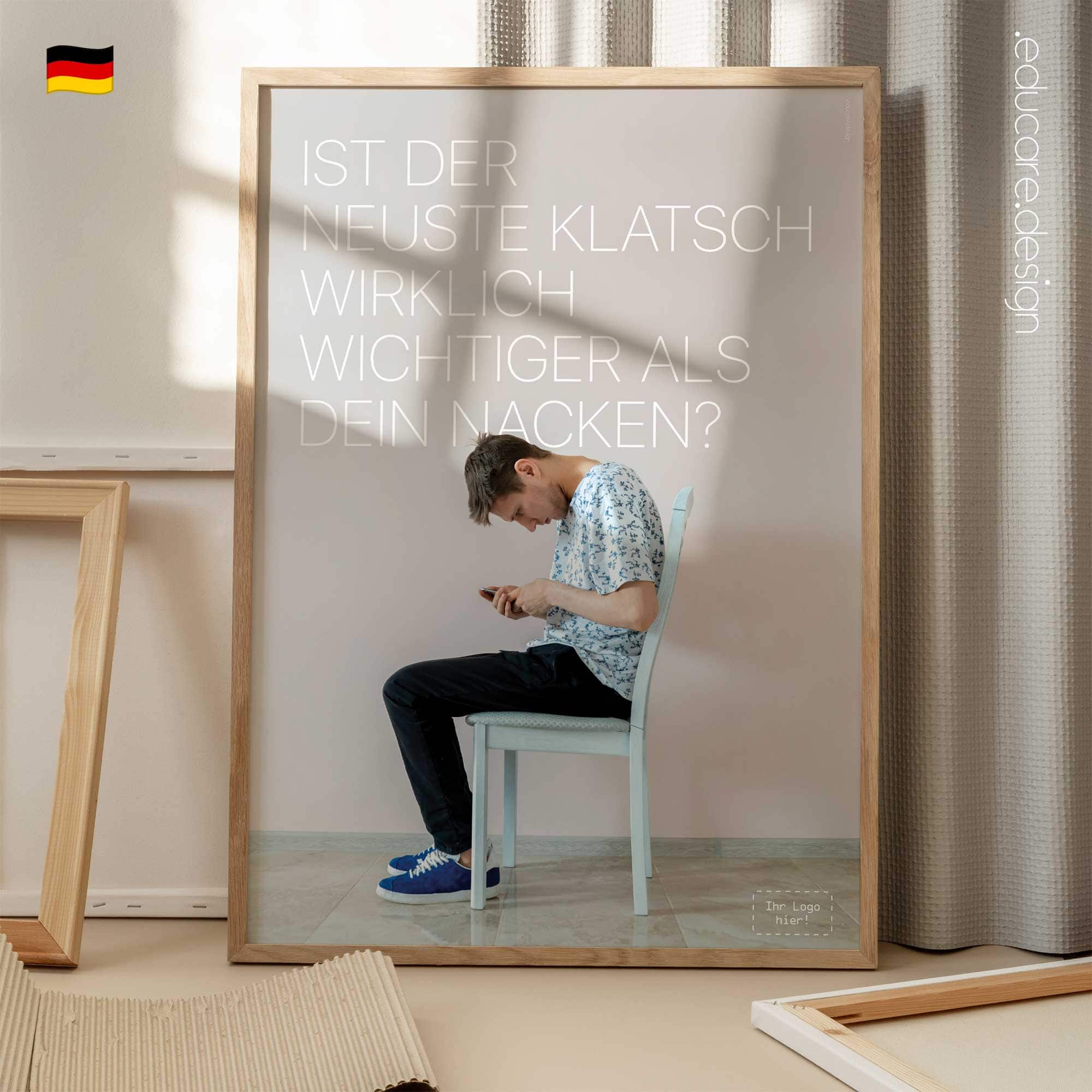 Displayed in treatment rooms, reception areas or consultation spaces, the poster quickly resonates with modern patients. Many will recognise their own screen habits immediately, creating a natural opening for conversations about posture, ergonomics and healthy device use. The design follows the recognisable educare.design visual language: clean photography, minimal typography and a calm colour palette that integrates naturally into modern clinics and wellness environments. The result is a visually striking poster that communicates an important message about posture and everyday health.