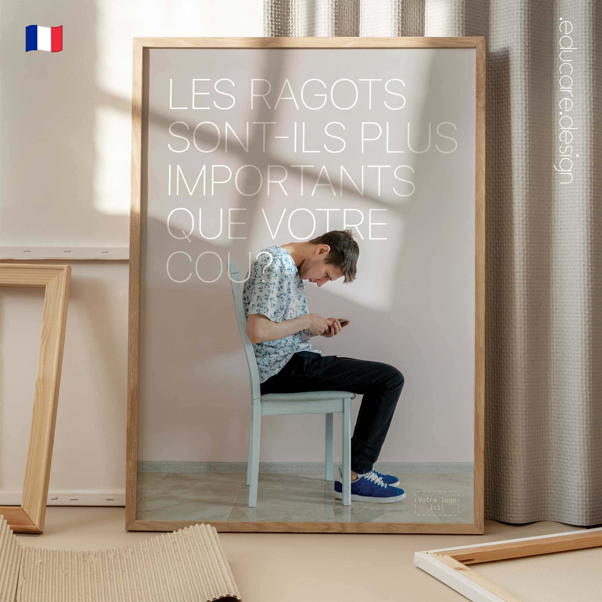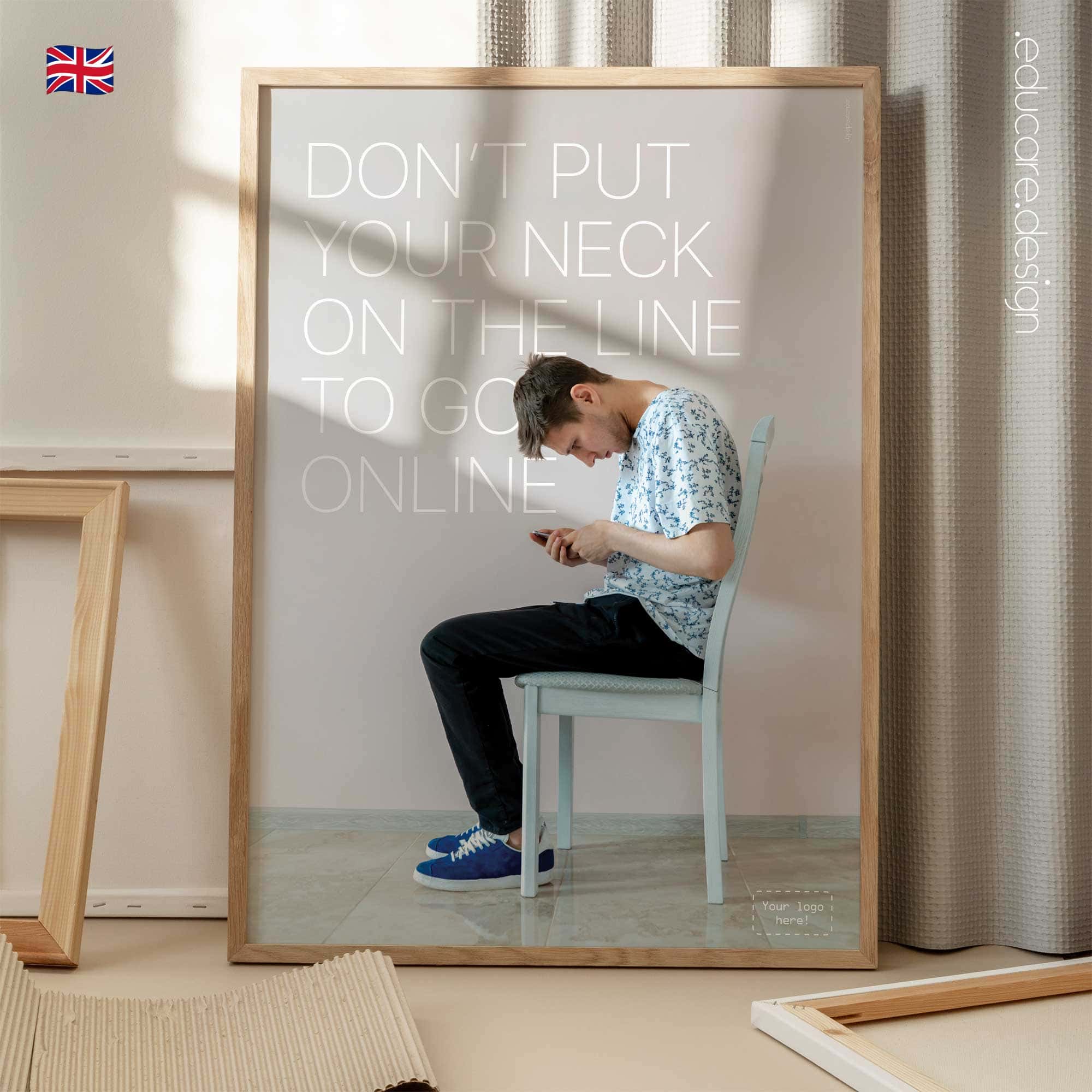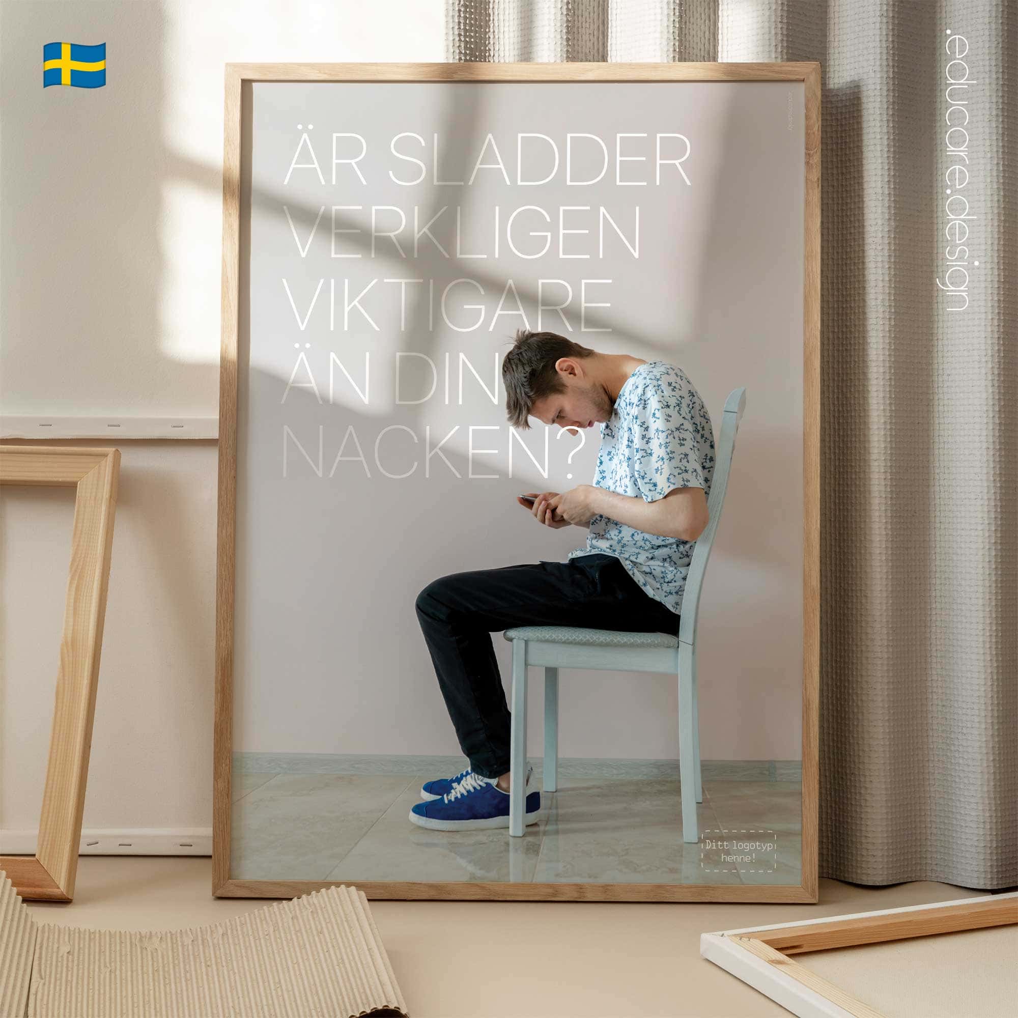 Displayed in treatment rooms, reception areas or consultation spaces, the poster quickly resonates with modern patients. Many will recognise their own screen habits immediately, creating a natural opening for conversations about posture, ergonomics and healthy device use. The design follows the recognisable educare.design visual language: clean photography, minimal typography and a calm colour palette that integrates naturally into modern clinics and wellness environments. The result is a visually striking poster that communicates an important message about posture and everyday health.