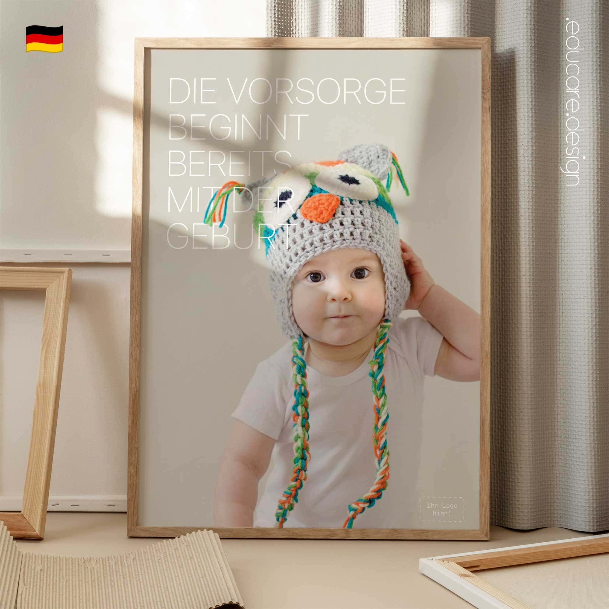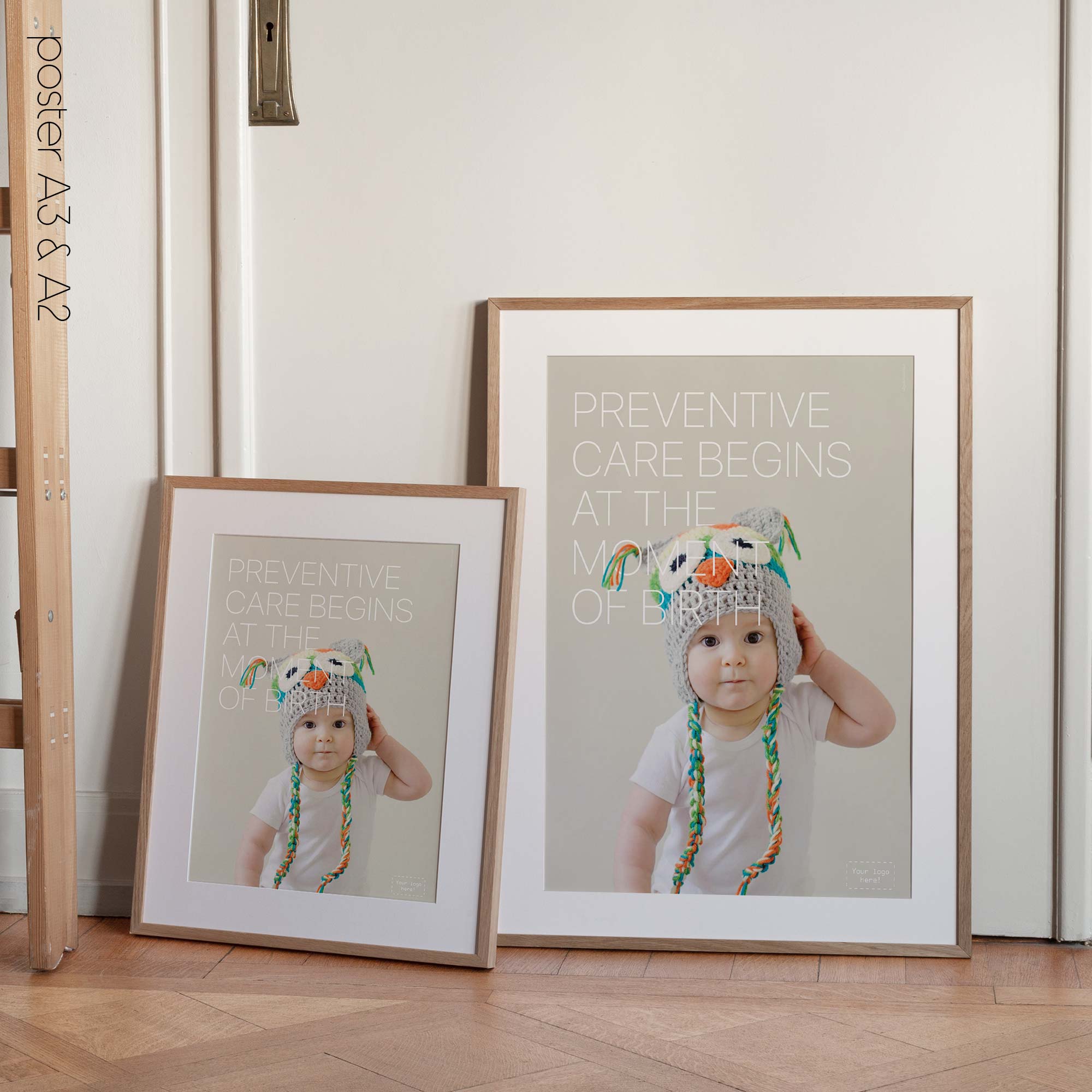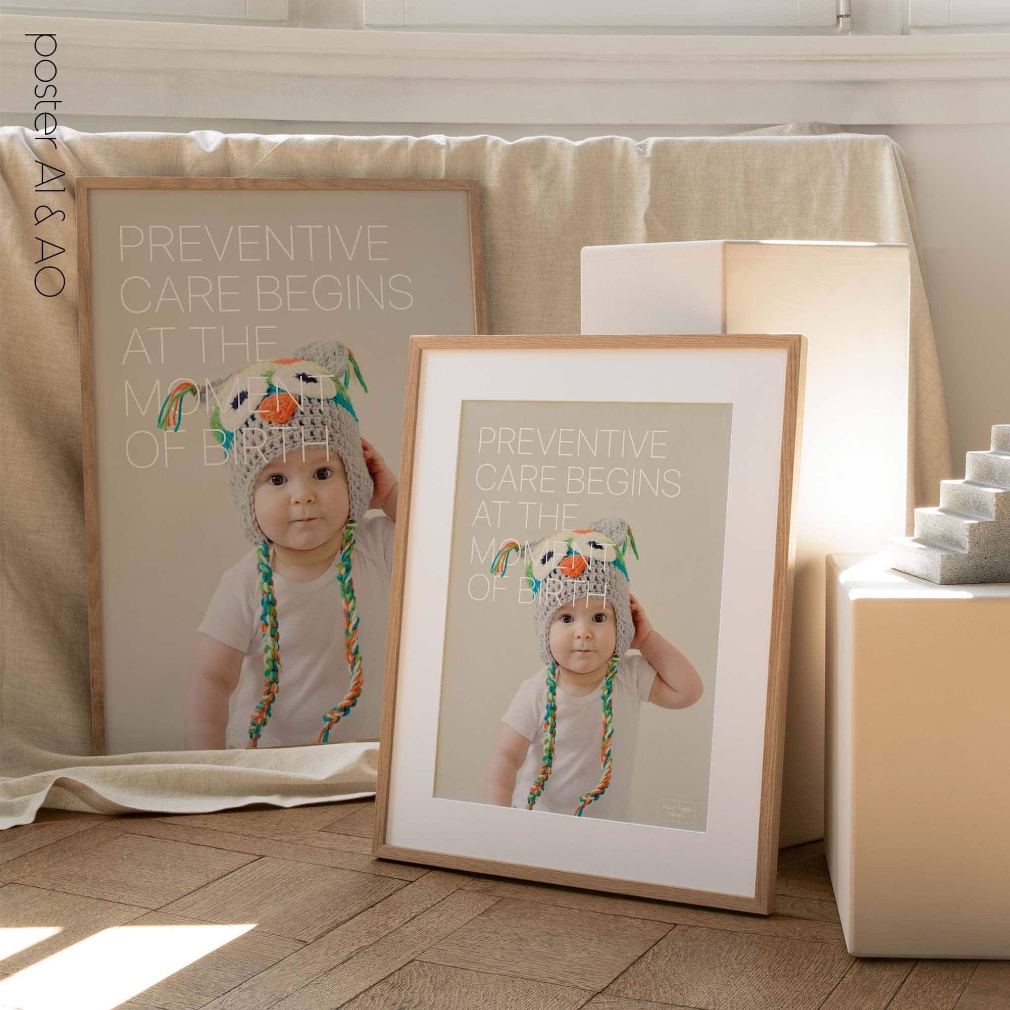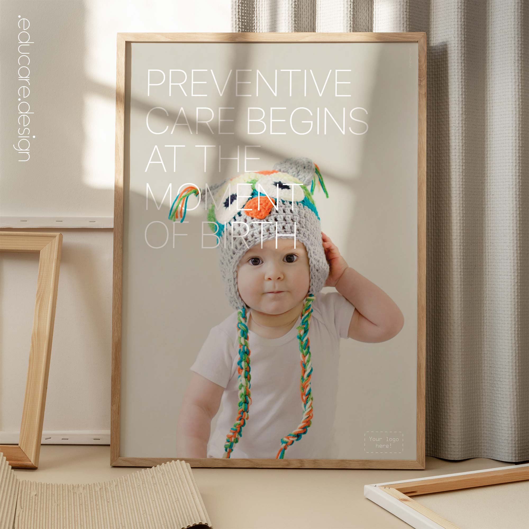Displayed in waiting rooms, reception areas or paediatric consultation spaces, the poster creates a warm and reassuring atmosphere for parents and families. The expressive photography and minimal typography follow the recognisable educare.design visual language, allowing the artwork to integrate naturally into modern clinics and wellness environments. The result is a gentle yet powerful reminder that the foundations of lifelong health begin at birth.